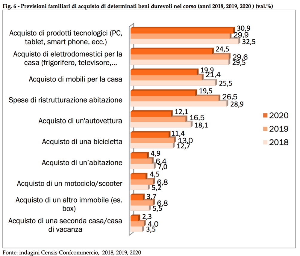 In questo quadro di incertezza e di pessimismo, come procederanno gli acquisti degli italiani da qui alla fine dell’anno? Una prima indicazione la si ritrova nelle previsioni di acquisto che ogni anno Censis e Confcommercio rilevano nell’ambito dell’Osservatorio Outlook Italia. L’indagine 2020 (realizzata a marzo) conferma la gerarchia delle diverse tipologie di beni. Le previsioni premiano i beni tecnologici: sono circa il 30% le famiglie che pensano di acquistarli.