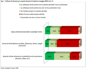 In sintesi, più di due terzi degli italiani maggiorenni hanno praticato l’e-commerce(probabilmente anche attraverso la collaborazione con i familiari maggiormente esperti nell’uso della rete), poco più del 40% si è fatto consegnare la spesa a domicilio e circa un terzo ha utilizzato servizi di food delivery. Quest’ultima modalità, in effetti, risente di una variabile di offerta, essendo questo tipo di servizio localizzato esclusivamente nei comuni con una certa soglia dimensionale.