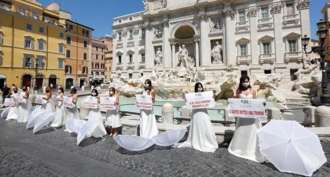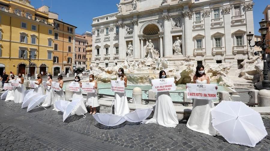 Non è un matrimonio collettivo ma il flashmob organizzato a Roma dall’Associazione italiana regalo, bomboniere, confetti e wedding, con lo slogan «Ridateci la libertà di festeggiare».