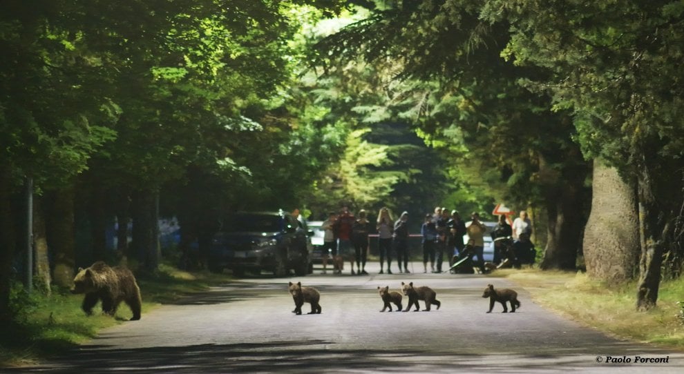 Mamma orsa che attraversa la strada con i quattro cuccioli sotto gli occhi ammirati di un gruppo di persone: è il momento immortalato pochi giorni fa dallo zoologo Paolo Forconi a Villalago, ai confini del Parco Nazionale d’Abruzzo Lazio e Molise. Forconi, che osserva e studia da anni gli orsi, ha fotografato gli animali il 3 luglio, intorno alle 21.30. “Già nel tardo pomeriggio avevamo visto l’orsa sul fianco della montagna, a mangiare ciliegie. Poi è scesa con i suoi piccoli a fare il bagno nel lago Pio, nei giardini pubblici di Villalago, e si è fermata a mangiare altre ciliegie da un albero proprio sul bordo della strada. Quando ci ha visti ci ha guardati e così hanno fatto anche i piccoli, sembrava quasi indecisa sul da farsi”.