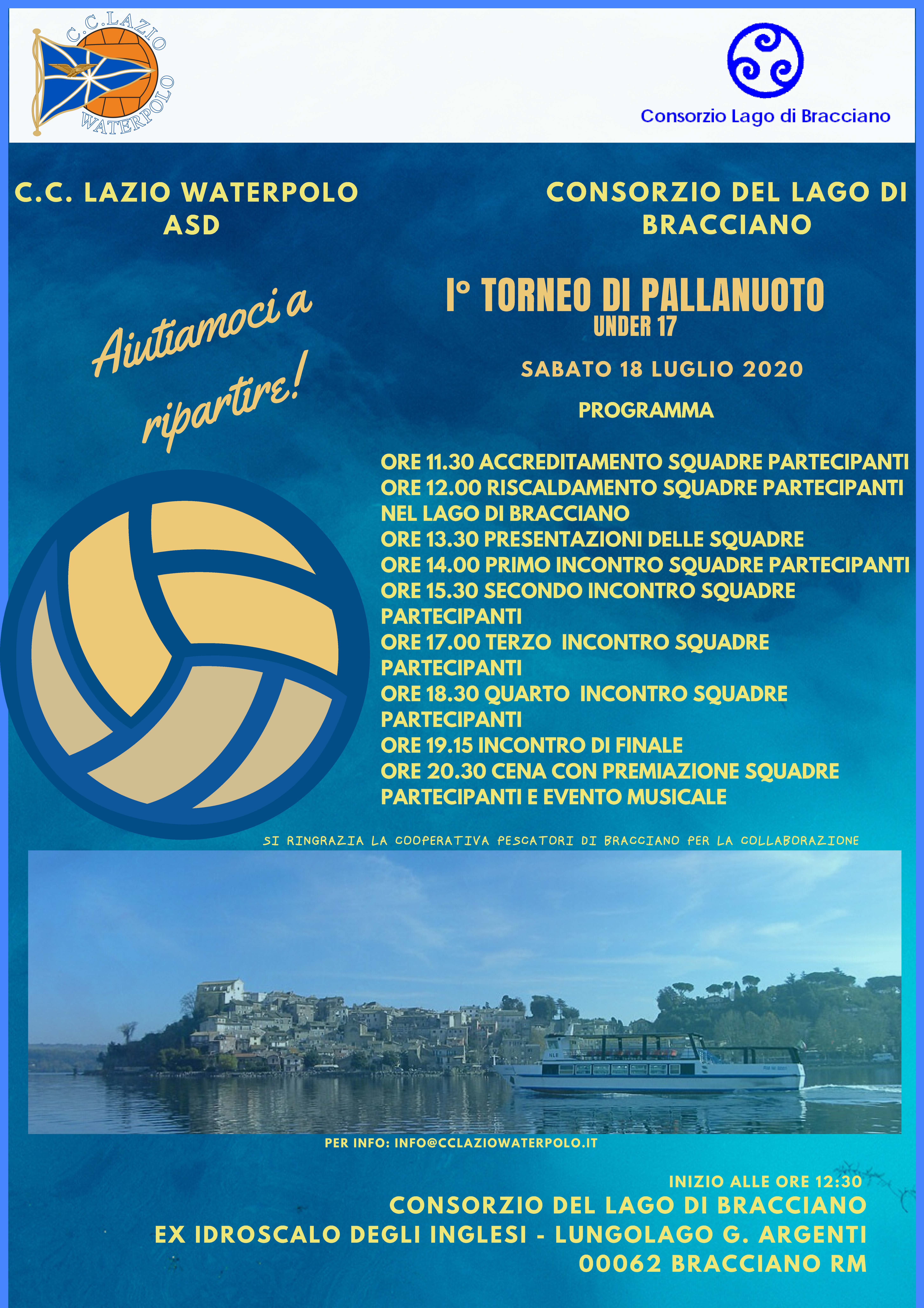 Abbiamo il piacere di informarLa che il prossimo 18 luglio 2020 la C.C.Lazio Waterpolo ASD in collaborazione con il Consorzio Lago di Bracciano ha organizzato il “I° TORNEO DI PALLANUOTO GIOVANILE NAZIONALE DEL LAGO DI BRACCIANO”.
