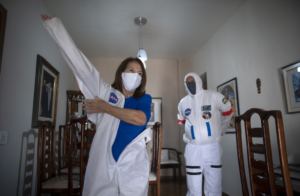 Un dispositivo di protezione inusuale nato dall’ingegno dello stesso Tercio: ha comprato tute bianche, le ha decorate per richiamare quelle indossate dagli astronauti, e ha aggiunto un casco per garantire la loro piena efficacia sanitaria contro il virus.