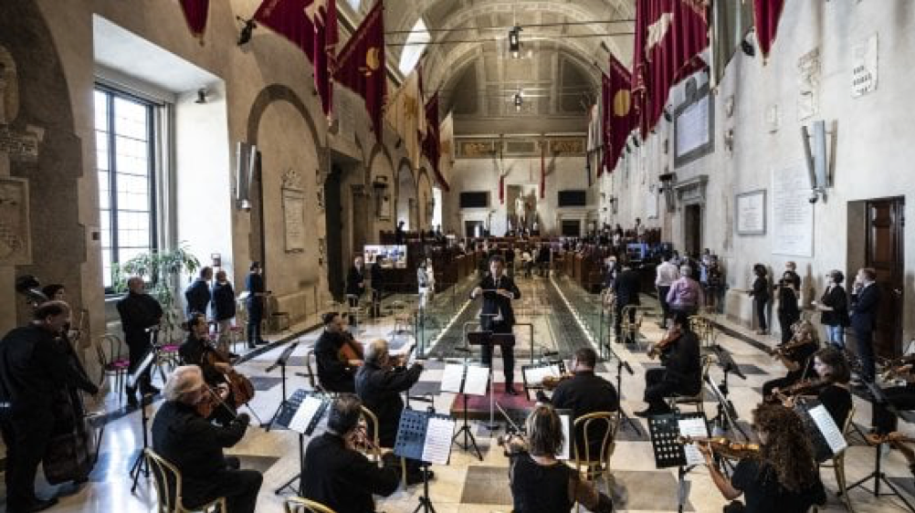La seduta dell’assemblea Capitolina è stata aperta da alcuni brani della colonna sonora di C’era una volta in America eseguiti in Aula Giulio Cesare alla presenza di famigliari e amici del maestro Ennio Morricone dall’orchestra di Santa Cecilia, in molte occasioni diretta dal musicista scomparso. L’omaggio è stato preceduto dal presidente dell’assemblea capitolina, Marcello De Vito. Presenti la sindaca e tutti i consiglieri.
