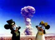 Nell’arte di Papeschi, attraverso l’accostamento di immagini patinate e simboli del male, emergono le conseguenze storiche e culturali più estreme provocate dai regimi totalitari prima e dal consumismo poi. L’artista opera una crasi tra immagini iconiche da cui scaturiscono figure ibride mostruose attraverso cui ritrarre tutti gli orrori di una società schiava dei consumi. Papeschi si serve della digital-art per permettere al pubblico di immergersi in scenari allegorici apparentemente “semplici”, innocui, popolati da figure che rimandano al mondo dell’infanzia, ma che nascondono in realtà nuovi messaggi subliminali. Così Topo Gigio, che l’artista identifica quale emblema nazionale del Bene, è in tenuta marziale in HIC SUNT LEONES, Mickey Mouse indossa la divisa nazista in NaziFuckingMouse ed Hello Kitty è sotto arresto in Hell-O-Kitty. Per From Hiroshima with Love e La Société du Spectacle Papeschi s’ispira alla letteratura di George Orwell, per la prima, che affronta la tematica del