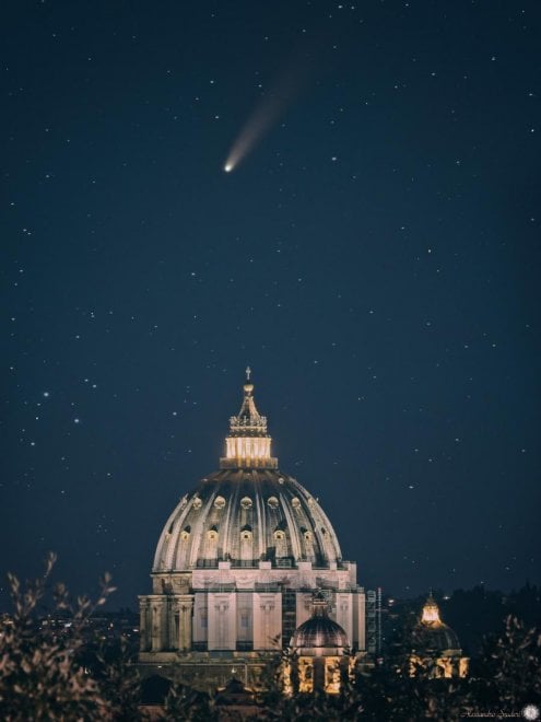 negli scatti realizzati da Alessandro Scuderi, che si è posizionato sulla terrazza del Gianicolo, c’è tutta la magia del cielo di Roma e di due tra i suoi monumenti più noti. Questi sono i giorni migliori – e anche gli ultimi – per osservare la cometa, che si può ancora scorgere a occhio nudo, sopra l’orizzonte a nordovest.