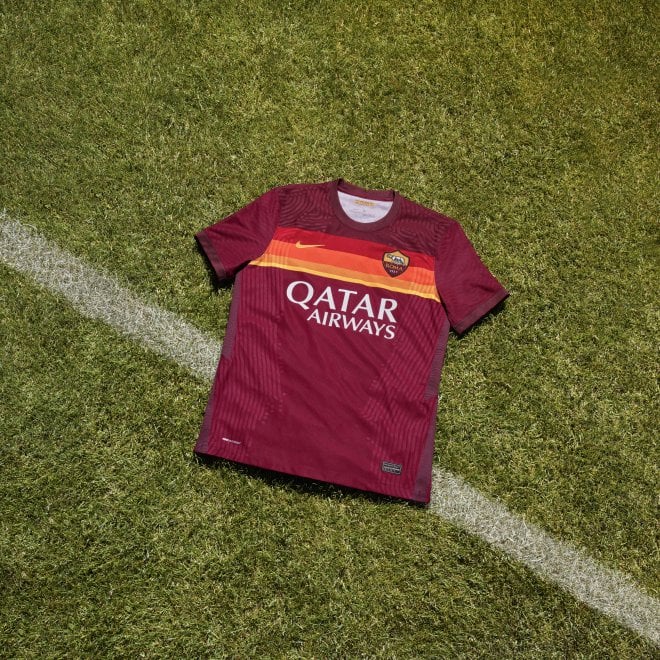 La Roma in campo contro la Fiorentina indossando la nuova maglia. Una divisa rossa, con le strisce orizzontali, sopra il petto, arancioni e gialle.