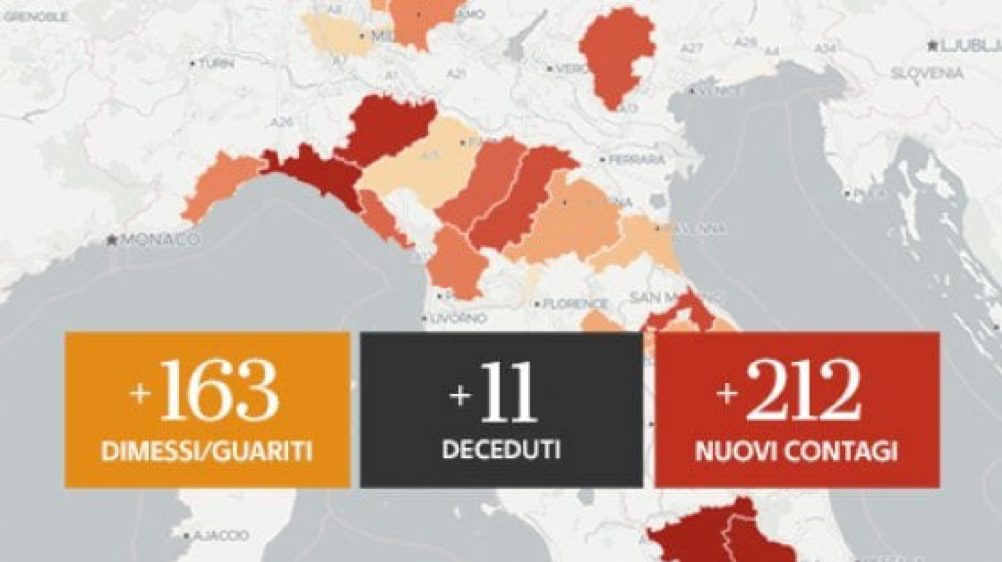 Le regioni in cui non si registrano nuovi contagi da ieri sono 5: Basilicata, Molise, Umbria, provincia autonoma di Trento e Friuli Venezia Giulia.