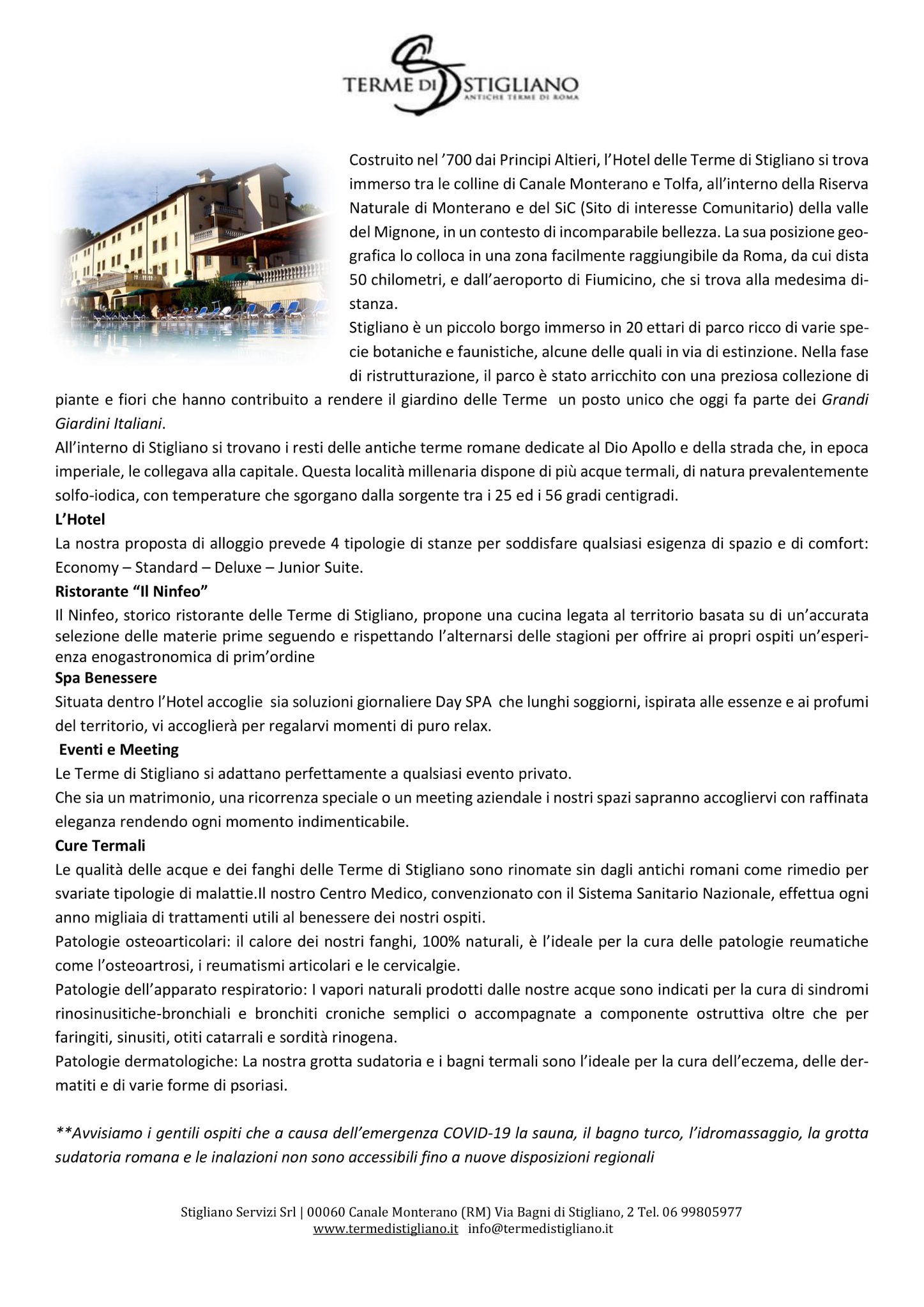 Anche per il 2020 e nonostante le difficoltà del periodo, Terme di Stigliano ha voluto confermare la convenzione con il Comune di Canale Monterano per l’accesso allo stabilimento termale a prezzi agevolati per i residenti.