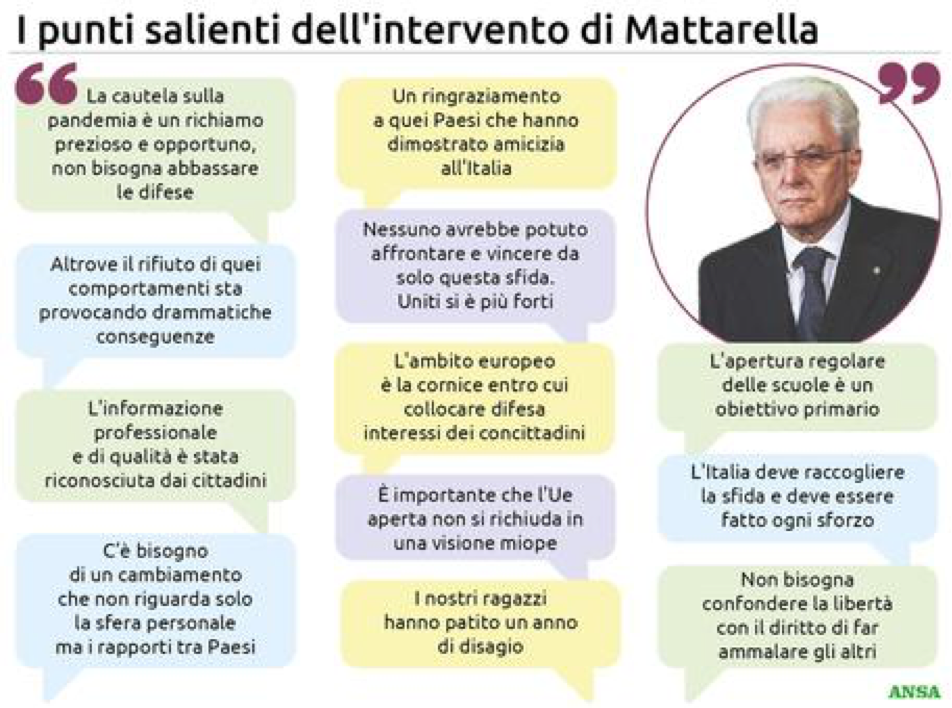 “Chiusi nelle nostre case – ha detto ancora il Capo dello Stato – abbiamo pensato spesso che il dopo avrebbe dovuto essere necessariamente diverso. E’ una consapevolezza del bisogno di cambiamento che non riguarda solo la sfera personale ma che si registra nei rapporti tra Paesi diversi. Tutti esposti alla medesima fragilità. La risposta si è tradotta in esperienze di preziosa, reciproca solidarietà, e desidero ringraziare quei Paesi che hanno dimostrato amicizia all’Italia, così come ha fatto l’Italia”.