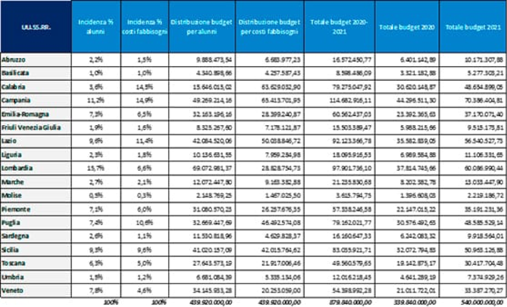 Il risultato è stato che la Calabria, con il 3,6 per cento degli studenti, ha avuto 30,6 milioni di euro (necessari per pagare gli insegnanti supplenti) per il 2020 quando l’Emilia Romagna, che ha il doppio degli alunni iscritti, ha ricevuto quasi 7 milioni in meno. Ancora, la Lombardia, con il 15,7 per cento degli alunni totali, ha ottenuto 37,8 milioni, quasi sette in meno della Campania (la regione più premiata con 44,3 milioni) che pure ha solo l’11,2 per cento degli studenti. Alla richiesta di spiegazioni dell’assessora toscana Cristina Grieco, responsabile, tra l’altro, del tavolo delle regioni per l’istruzione, la ministra ha risposto: “Ci sono territori in difficoltà che hanno più bisogno”. In totale, la prima ripartizione ha impegnato 340 milioni di euro per il 2020 e prevede di impiegarne altri 540 per la prossima stagione.