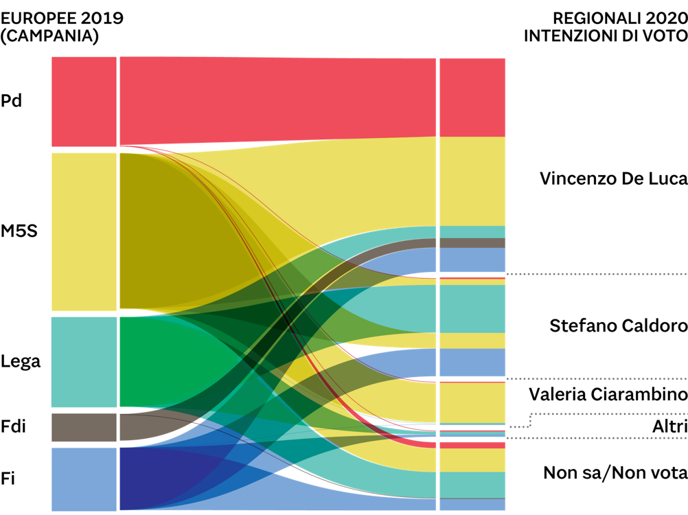 Gli accordi fatti da De Luca con i vari De Mita e Mastella sono una delle ragioni del suo successo. Un’altra è il numero di liste che lo sostengono, addirittura 15. Anche queste fanno parte di una precisa strategia di raccolta di consensi. Questa è la politica in Campania. E De Luca sa come adattarvisi. Anche per questo il centro-sinistra a livello proporzionale viene stimato oggi al 44,8%, mentre alle politiche del 2018 aveva preso il 16,4% e alle europee dello scorso anno il 23,1.
