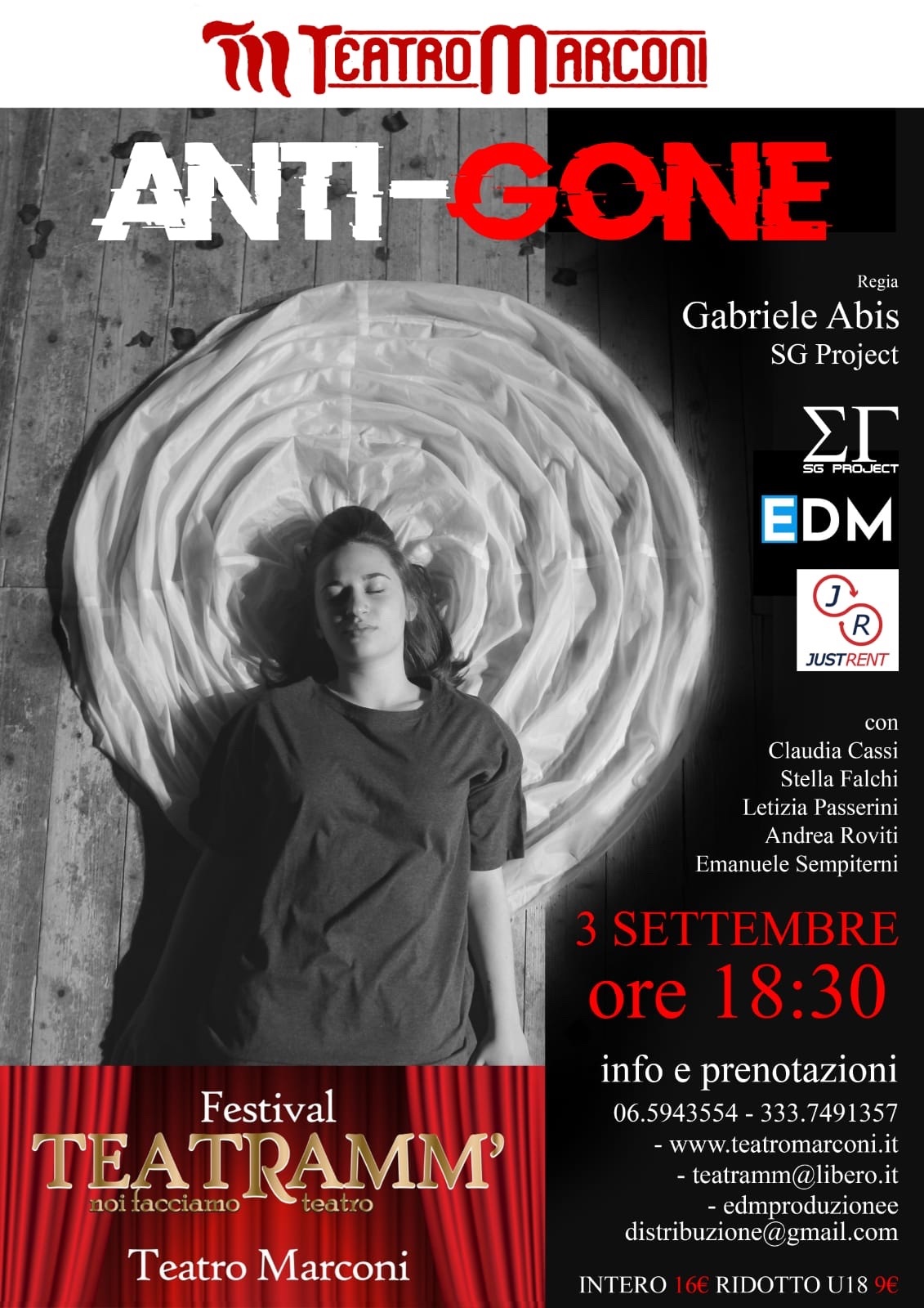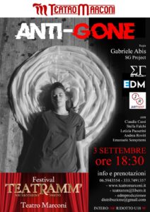 Anti-Gone, dramma teatrale di Sofocle, nell’interpretazione messa in scena dalla compagnia SG Project di Ladispoli, è stata selezionata per la seconda edizione del Festival TEATRAMM’ del Teatro Marconi di Roma.