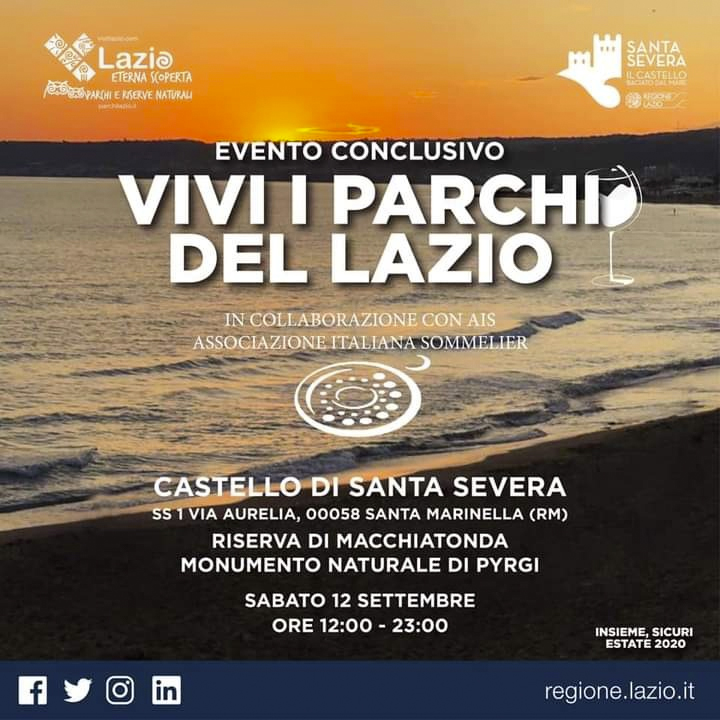 Sarà il suggestivo Castello di Santa Severa a ospitare sabato 12 settembre la giornata conclusiva di “VIVI I PARCHI DEL LAZIO. Suoni ‘di- vini’ tra le radici della nostra regione”, il viaggio “enologico-musicale” nei Parchi regionali del Lazio, organizzato dall’Assessorato Agricoltura, Promozione della Filiera e della Cultura del Cibo, Ambiente e Risorse Naturali della Regione Lazio con la Direzione Regionale Capitale Naturale, Parchi e Aree Protette, in collaborazione con AIS Lazio – Associazione Italiana Sommelier.