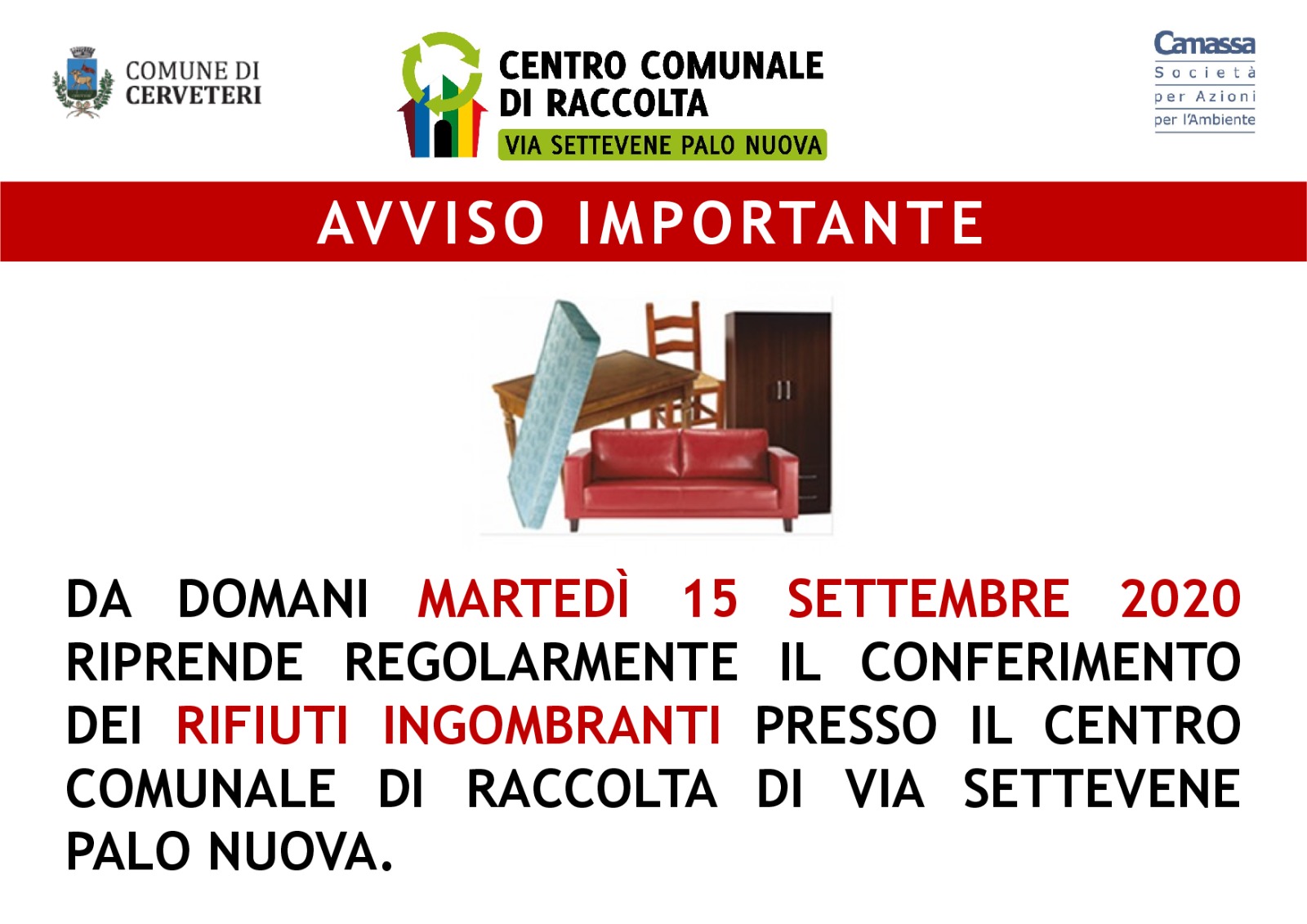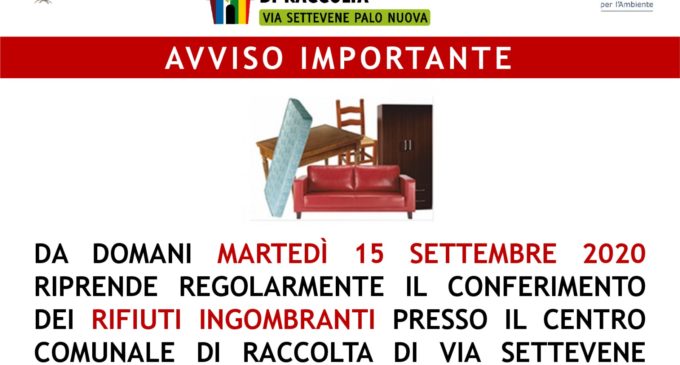L’amministrazione comunale di Cerveteri informa la cittadinanza che da domani, 15 Settembre, riprende regolarmente il conferimento dei rifiuti ingombranti presso il Centro Comunale di Raccolta di Via Settevene Paolo Nuova dopo lo stop di venerdì 11 Settembre dovuto a una improvvisa e momentanea chiusura dell’impianto di destinazione.