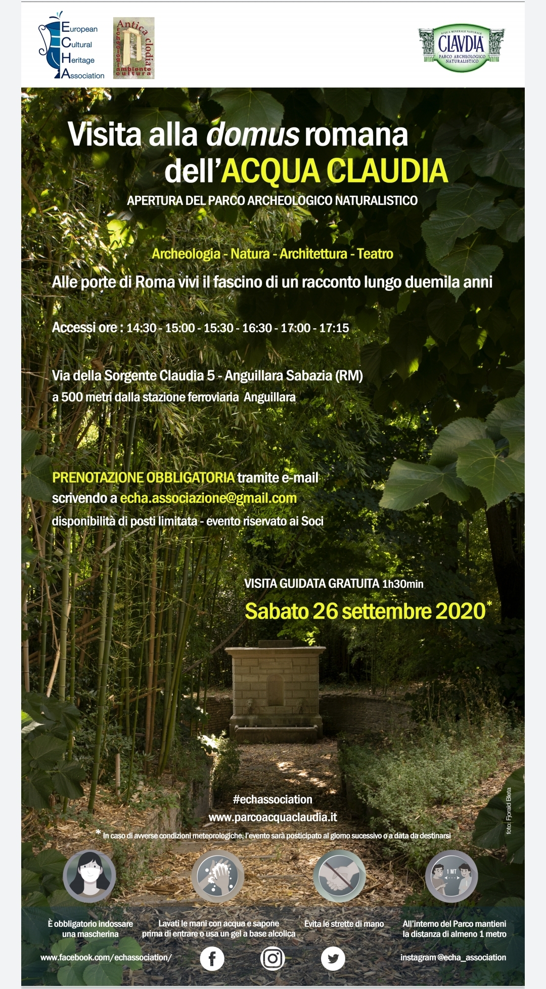 L’Associazione “ECHA” organizza un’apertura straordinaria del Parco Archeologico Naturalistico dell’Acqua Claudia sito ad Anguillara per sabato 26 settembre. In tale occasione si potrà visitare il Parco tramite una visita guidata della durata di un’ora e mezza. Le visite saranno suddivise in più orari e sono prenotabili all’indirizzo mail echa.associazione@gmail.com