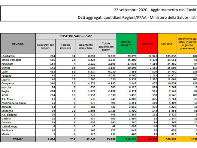 I dati del bollettino sulla pandemia di Covid-19, aggiornati al 22 settembre