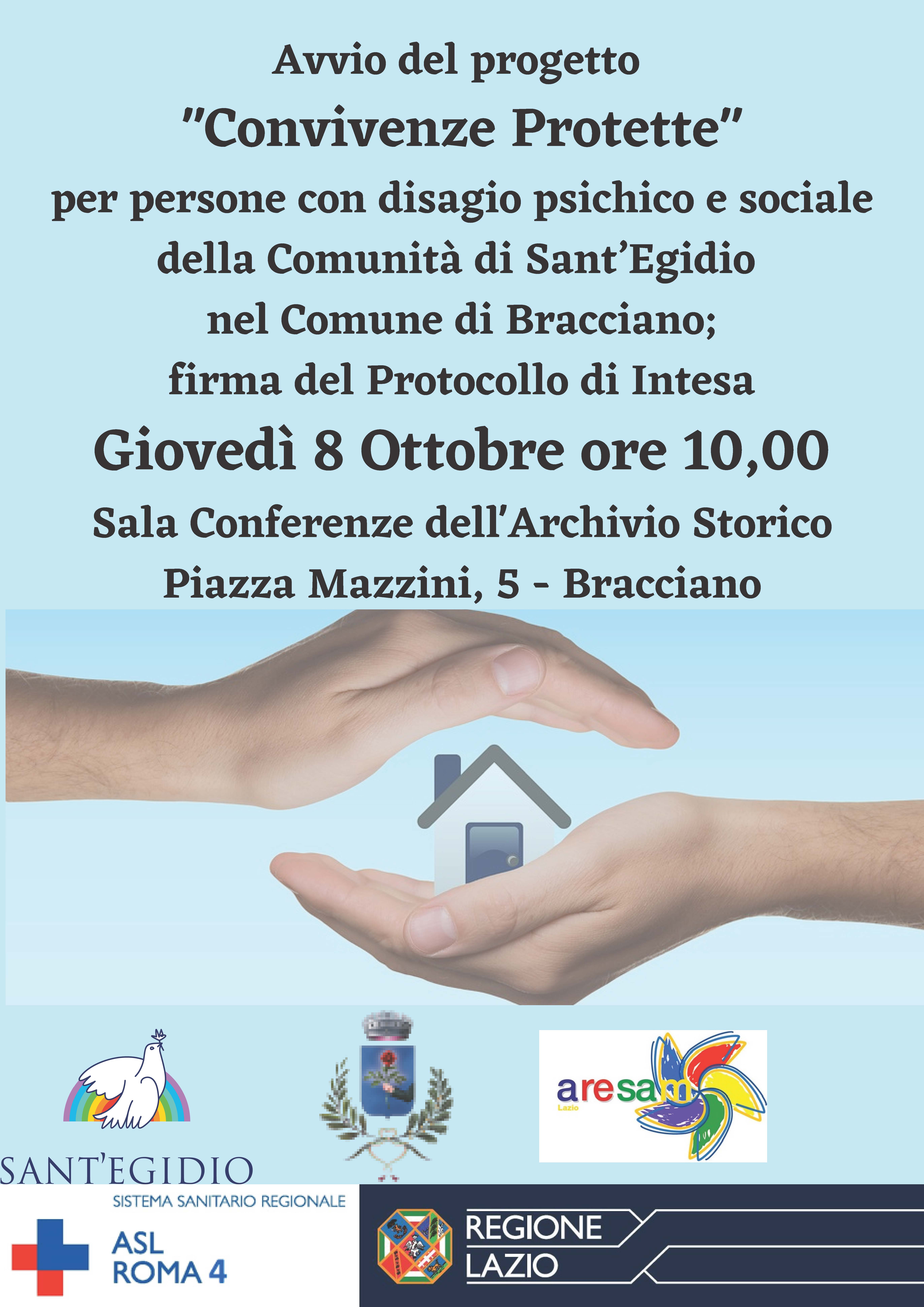 Il prossimo 8 Ottobre 2020 si svolgerà presso la Sala Conferenze dell’Archivio Storico la Conferenza Pubblica per promuovere l’avvio del progetto “Convivenze protette per persone con disagio psichico e sociale “ organizzate dalla Comunità di Sant’Egidio in collaborazione con la ASL Roma 4, il Comune di Bracciano e l’Associazione dei familiari ARESAM. Le convivenze protette, supportate da operatori e volontari, rappresentano un modello di residenzialità e cure territoriali per persone fragili a costi sostenibili a fronte di importanti risultati in termini di salute e qualità di vita. Le convivenze di Sant’Egidio costituiscono un esempio virtuoso di applicazione della legge 180 del 1978 che ha riformato l’assistenza alle persone con disturbi mentali in Italia. La Comunità di Sant’Egidio ha avviato il progetto Civitavecchia nel 2012 in collaborazione con la ASL Roma 4. Oggi a Civitavecchia esiste una rete di otto convivenze di Sant’Egidio in collaborazione con il Dipartimento di Salute Mentale ed il Servizio per le Dipendenze. In questi anni hanno prodotto una riduzione dei ricoveri ospedalieri presso il reparto psichiatrico aumentando la salute mentale e consentendo alle persone di vivere nel loro luogo di origine in normali appartamenti in prossimità di servizi commerciali e sanitari ed in compagnia di altre persone che contribuiscono a ricostituire un tessuto familiare.