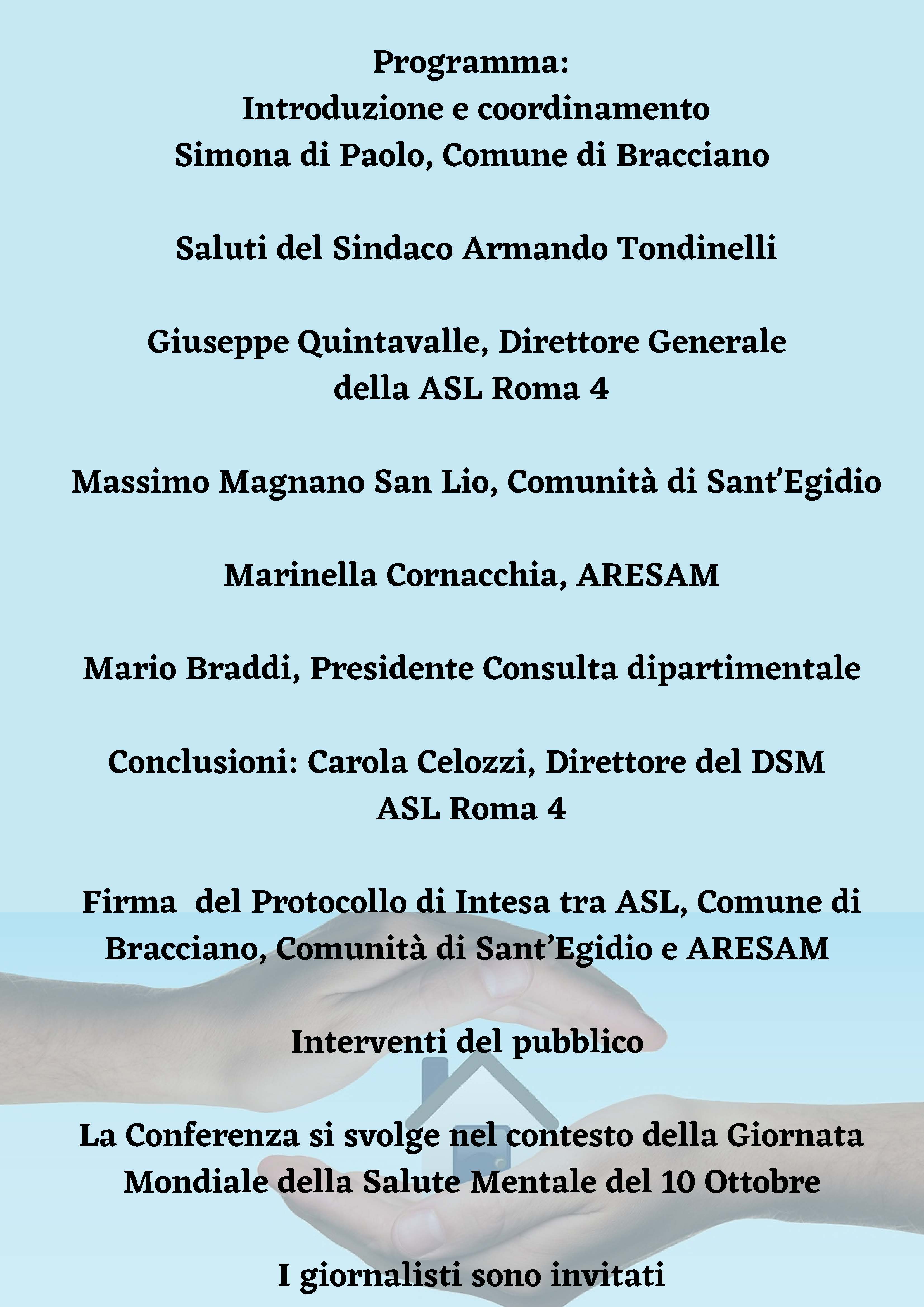 Alla conferenza pubblica pubblica, che si svolgerà nel pieno rispetto delle pratiche di prevenzione secondo i protocolli del Ministero della Salute, interverranno il Sindaco Alessandro Tondinelli, il Direttore Generale della ASL Roma 4 Giuseppe Quintavalle, Massimo Magnano San Lio per la Comunità di Sant’Egidio e Marinella Cornacchia per l’associazione dei familiari ARESAM. Ci sarà un contributo anche di Mario Braddi, presidente della Consulta Dipartimentale. Carola Celozzi, direttore del Dipartimento di Salute Mentale farà le conclusioni. Al termine degli interventi si svolgerà la firma ufficiale del Protocollo di Intesa tra la Comunità di Sant’Egidio, la ASL Roma 4, Il Comune di Bracciano e l’associazione ARESAM. La prima convivenza protetta inizierà a Bracciano proprio in questi giorni.