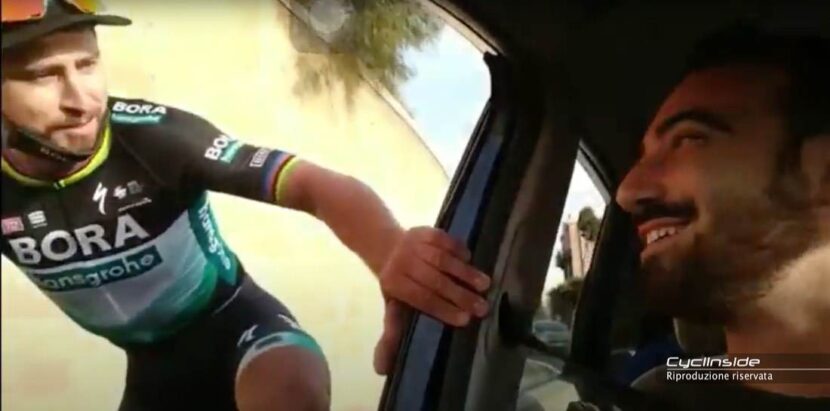 Questi ragazzi stavano percorrendo in auto una strada di Agrigento, in Sicilia e mai si sarebbero aspettati di poter aiutare Peter Sagan. Il ciclista slovacco, dopo l’arrivo della seconda tappa del Giro d’Italia, si era infatti smarrito in cerca della via per raggiungere l’hotel e ha “approfittato” della presenza dei ragazzi per farsi trainare per alcuni metri. “Io ho Sagan attaccato alla macchina”, dice il guidatore, mentre l’amico al suo fianco sorride e riprende la scena. “Non è una cosa che succede sempre, una volta è successo che mi hanno mandato da un’altra parte”, ha detto Sagan prima di staccarsi e ringraziare i quattro ragazzi, emozionati per l’accaduto.