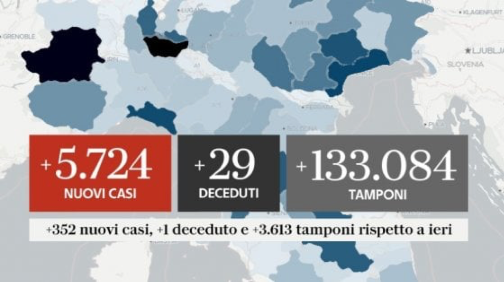 Continuano a crescere i contagi da coronavirus in Italia. Nelle ultime 24 ore i positivi sono aumentati di 5.724 (ieri erano stati 5.372), con 29 morti (ieri 28). Lo si apprende dai dati del Ministero della Salute. I tamponi sono stati 133.084, nuovo record (ieri 129.471). La Lombardia registra 1.140 nuovi positivi, la Campania 664. I ricoverati con sintomi aumentano di 250 unità in 24 ore, portando il totale a 4.336, mentre i pazienti in terapia intensiva sono 3 in più in un giorno, arrivando a 390. Le persone in isolamento domiciliare crescono di ben 4.466 e sono ora 70.103, mentre gli attualmente positivi arrivano 74.829 con un incremento di 4.719. Infine i dimessi e guariti sono 238.525, aumentando di 976 unità.