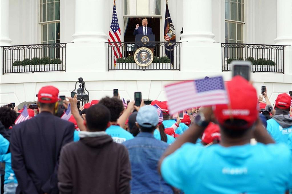 Donald Trump si riprende la scena. Dopo giorni di isolamento e reclusione nella sua gabbia dorata, il presidente torna in pubblico con uno show di 15 minuti alla Casa Bianca davanti a migliaia di persone alle quali si rivolge a distanza, dal balcone. “L’America non diventerà un Paese socialista”, esordisce, per poi rassicurare sulla sua salute: “Sto bene, sradicheremo il virus, il vaccino sta per arrivare. Le misure del lockdown non sono scienza”. Infine, un invito al voto, “è l’elezione più importante che abbiamo avuto nella storia del Paese”. È stato notato che pochissimi dei sostenitori del presidente usavano la mascherina (e nemmeno lui, del resto)