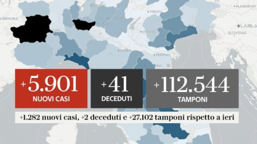 I nuovi casi di coronavirus in Italia nelle ultime 24 ore sono 5.901, rilevati sulla base di 112.544 tamponi, 41 i deceduti. Il totale dei decessi dall’inizio dell’emergenza è di 36.246. Sempre nelle ultime 24 ore i pazienti guariti/dimessi sono stati 1.428. Sono invece 514 i pazienti ricoverati in terapia intensiva (62 in più). Ieri i nuovi contagi nelle 24 ore erano stati 4.619, su 85.442 tamponi, mentre le vittime erano state 39. Aumentano anche i ricoveri ordinari (+255),per un totale di 5076. Le regioni col maggior numero di casi sono Lombardia (1080), Campania (635), Piemonte (585) e Lazio (579).