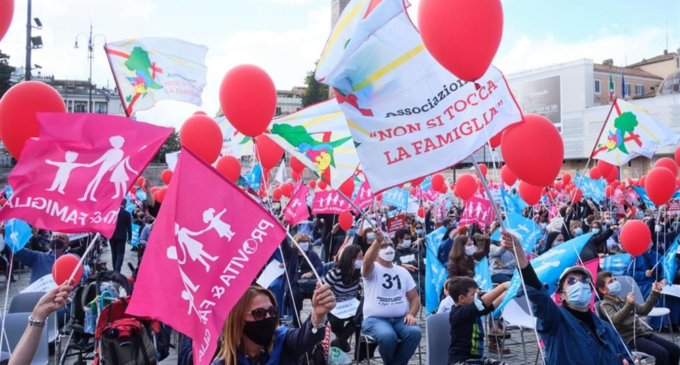 Una grande festa colorata con tanti palloncini rossi a evocare il diritto dei bambini a essere accolti ed educati nell’ambito di una famiglia fondata sul matrimonio di un papà e una madre. Erano più di mille, oggi, in piazza del Popolo, rigorosamente seduti e distanziati in base alle norme anti Covid, «per dire no alla norma liberticida del ddl Zan» (che intende contrastare l’omofobia e la transfobia con una specifica previsione da inserire nel codice penale) rispondendo all’appello di oltre 50 associazioni, aderenti al cartello#restiamoliberi, guidate dal Comitato “Difendiano i nostri figli”.