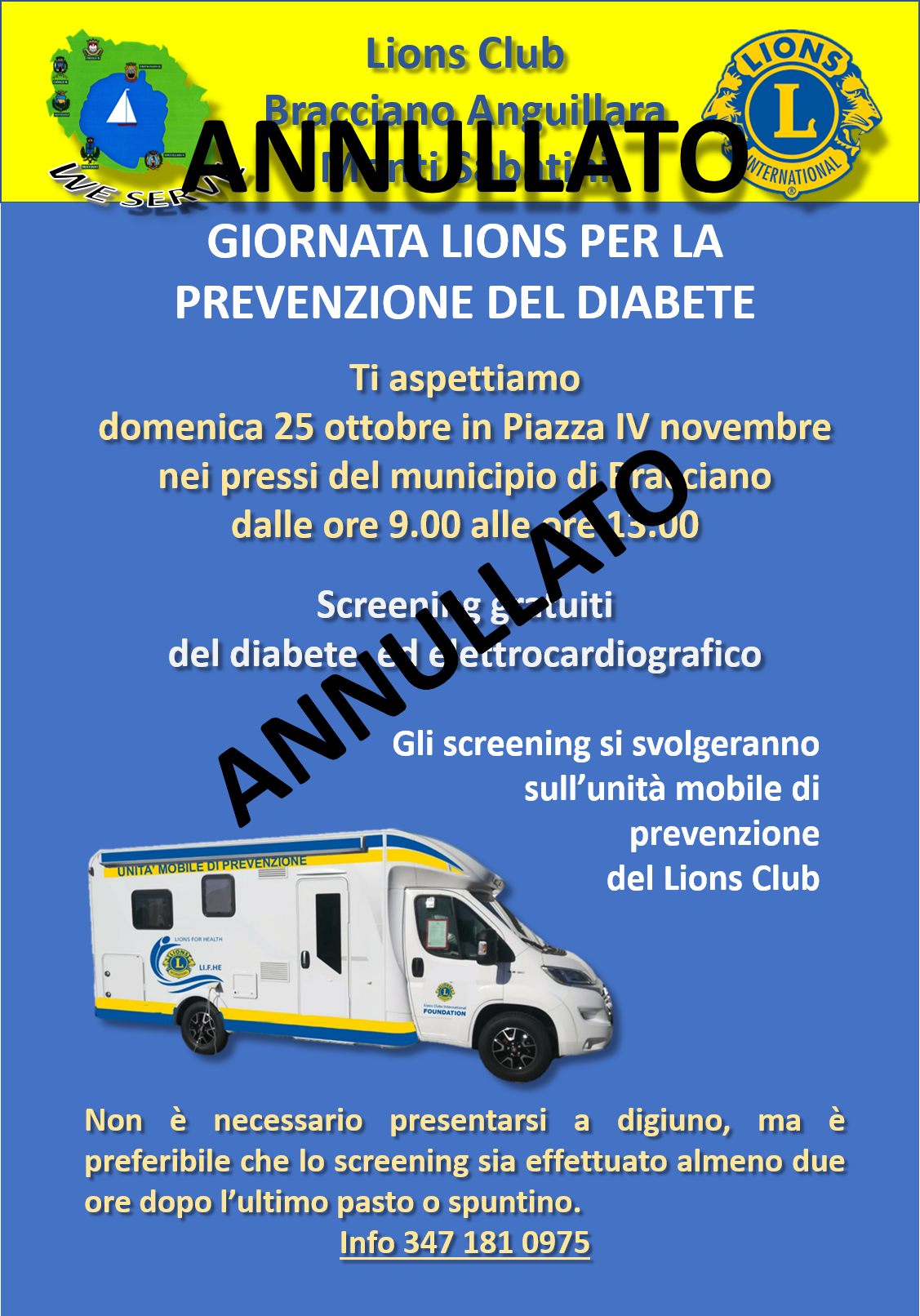 Il Lions Club di Bracciano Anguillara Monti Sabatini dedica una giornata alla prevenzione a Bracciano, con screening per il diabete e screening elettrocardiografico gratuiti, su una unità mobile di prevenzione allestita dal Lions Club Nazionale.