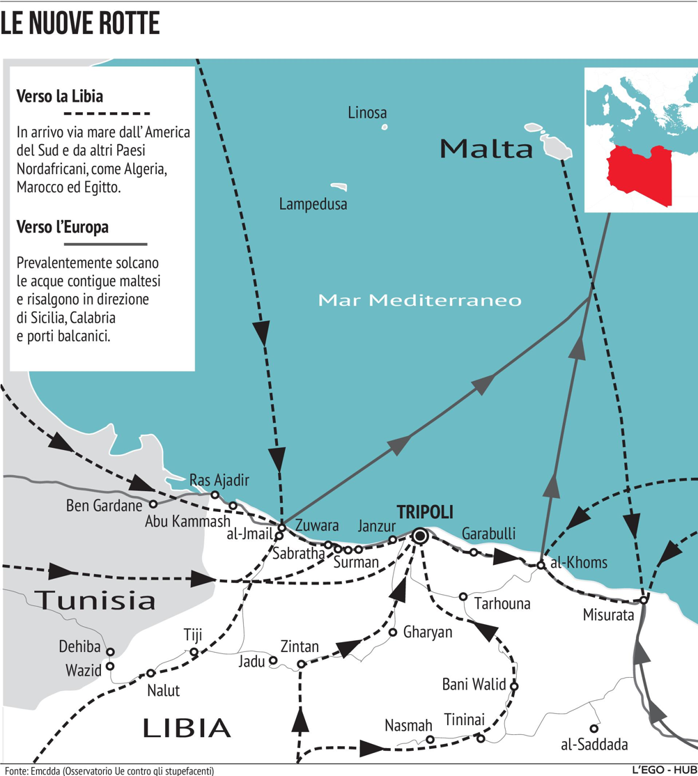 «Il traffico di droga ha ricevuto scarsa attenzione, anche se è stato accertato che la tratta di migranti, che è l’obiettivo principale del coinvolgimento europeo in Libia, fa parte di una più ampia economia sommersa che coinvolge vari tipi di attività criminali». Ad accusare i governi del Vecchio Continente di «scarsa attenzione» non è una una Ong, ma l’Emcdda, l’Osservatorio antidroga dell’Unione Europea. «E’ stato sviluppato un sistema complesso, che collega gli attori criminali libici e i leader delle milizie, coinvolti in diverse forme di contrabbando e tratta, con aziende e uomini d’affari con interessi nel commercio legale in Libia, Malta, Italia, Spagna, Grecia, Cipro, Albania, Montenegro, Turchia, Siria, Libano, Egitto e Emirati Arabi Uniti (Dubai)», si legge in un dettagliato report tenuto nei cassetti delle cancellerie di tutta Europa. In altre parole, mentre Roma, La Valletta e Bruxelles erano impegnate a negoziare con le milizie pur di ridurre le partenze di migranti verso il Canale di Sicilia, proprio i capimandamento libici hanno capitalizzato la paura e le divisioni nell’Ue per rafforzare le alleanze criminali intercontinentali.