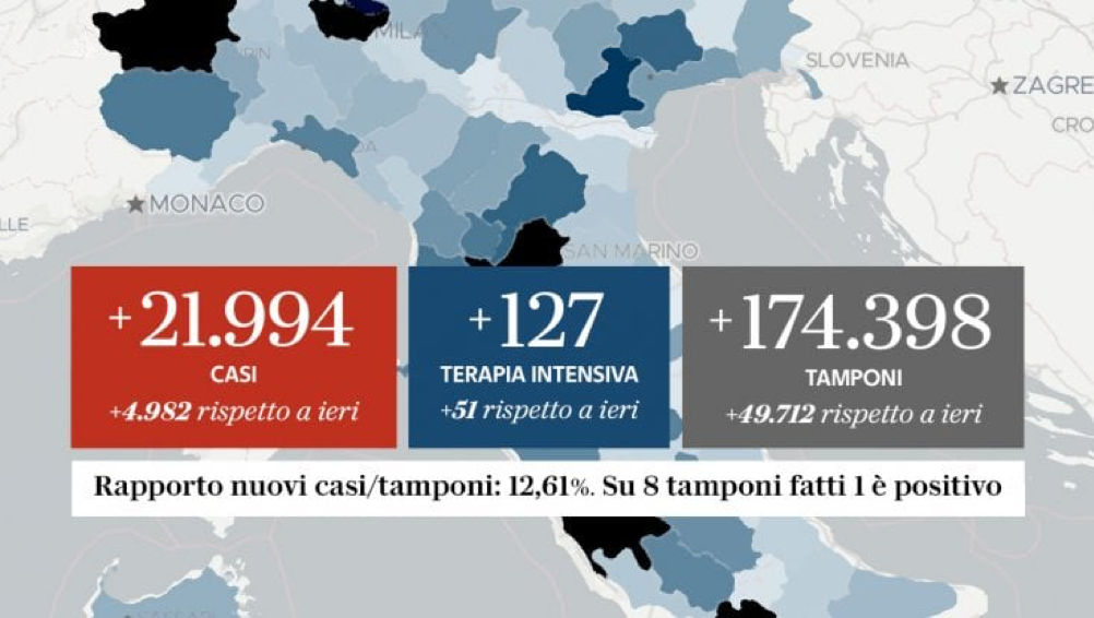 Nuovi record per contagi e vittime nelle ultime 24 ore in Italia. I positivi sono 21.994 a fronte di 174.398 tamponi. I morti sono 221, secondo i dati del ministero della Salute. Ieri c’erano stati 17.012 contagi e 141 morti. Il totale dei decessi dall’inizio dell’emergenza è di 37.700. Era dal 5 maggio che non si registrava un numero così alto di vittime, allora furono 236. È quanto emerge dal bollettino quotidiano del ministero della Salute.