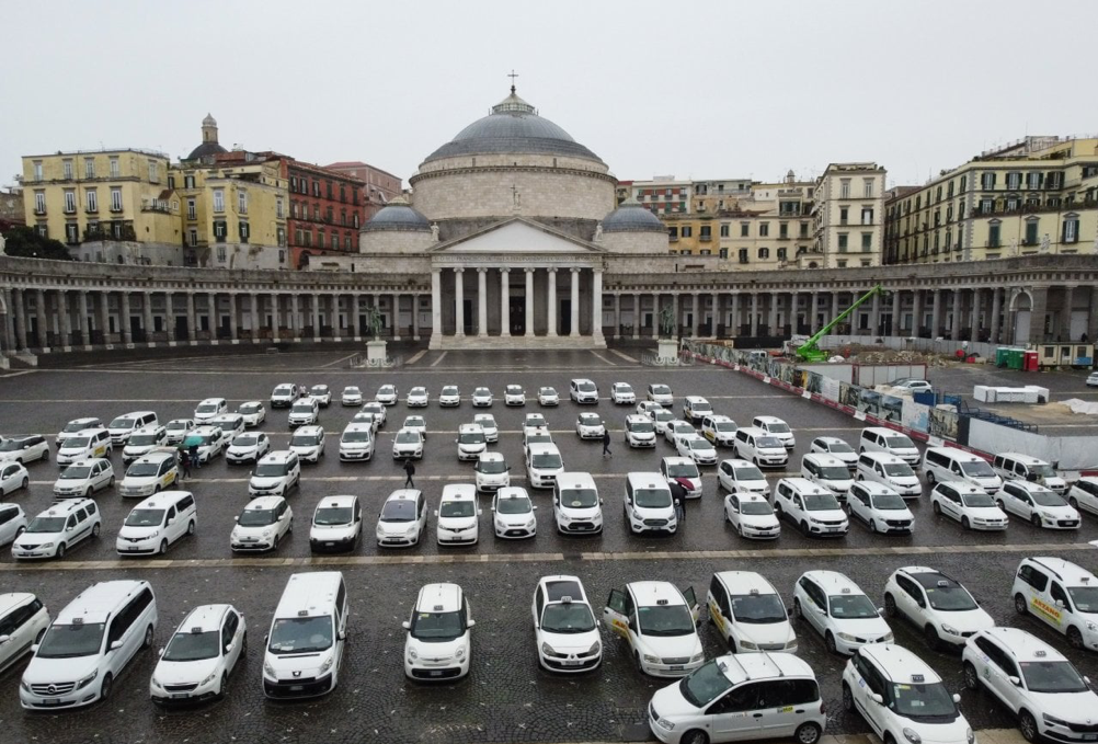 Le auto stanno arrivando, ne sono attese centinaia. Protestano i sindacati Unimpresa, sitan, Atn, Uritaxi, federartaxi, orsa taxi Napoli.