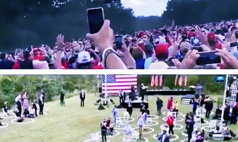 Da una parte, Trump che alimenta l'”onda rossa”, accompagnato da una folla entusiasta;