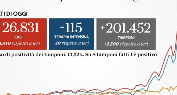 La percentuale di positivi nelle ultime 24 ore rispetto ai tamponi effettuati è del 13,3 per cento. I nuovi infetti sono 26.831 a fronte di 201.452 test, in base ai dati del ministero della Salute. Ieri la percentuale era stata del 12,5 per cento.