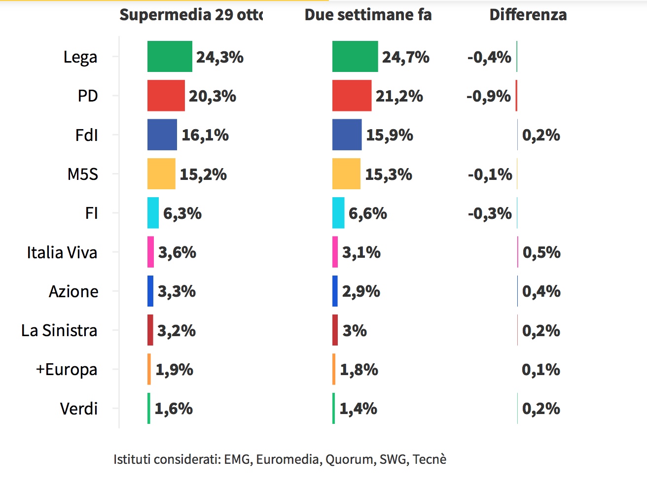 NOTA: La Supermedia YouTrend/Agi è una media ponderata dei sondaggi nazionali sulle intenzioni di voto, realizzati dal 15 al 28 ottobre dagli istituti EMG, Euromedia, Quorum, SWG e Tecnè. La ponderazione è stata effettuata il giorno 29 ottobre sulla base della consistenza campionaria, della data di realizzazione e del metodo di raccolta dei dati. La nota metodologica dettagliata di ciascun sondaggio considerato è disponibile sul sito ufficiale www.sondaggipoliticoelettorali.it.
