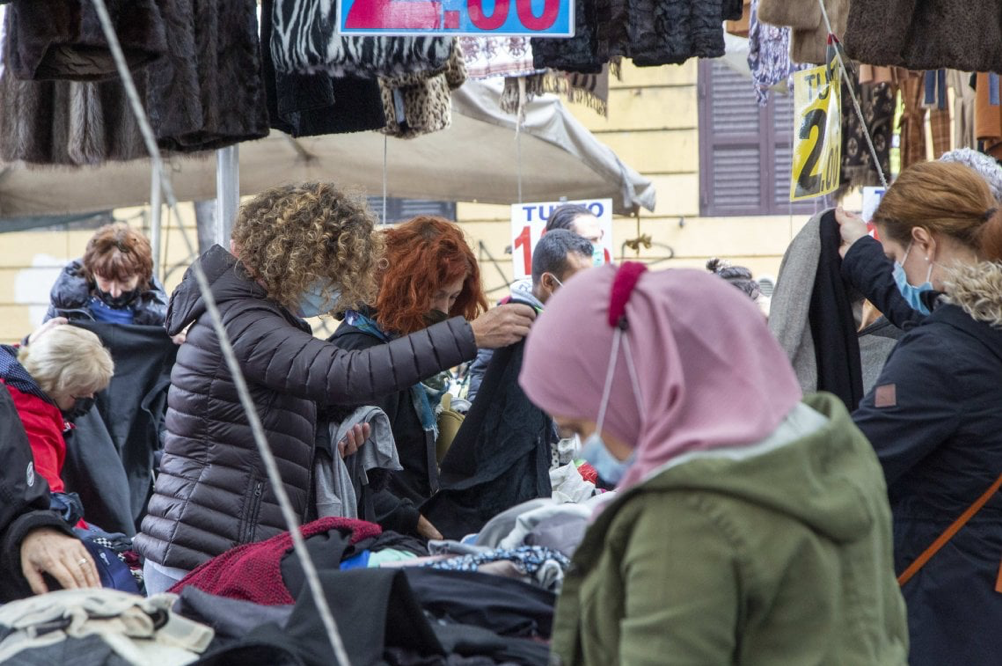Nei banchi dove i prodotti di maglieria a pochi euro sono esposti ammassati, tutti toccano tutto per vedere meglio taglie, fantasie, eventuali difetti. Ci sono, però, anche i commercianti che, invece, chiedono agli avventori di igienizzarsi le mani per toccare qualsiasi cosa sia esposta sul bancone e che li richiamano se si assembrano. Succede, per esempio, al banco delle stampe di piazza Ippolito Nievo o a quello con le affascinanti maschere tradizionali africane di via Ippolito Nievo.