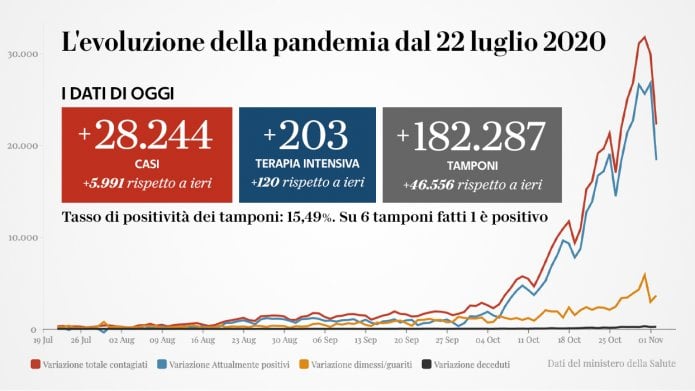 I nuovi contagiati da coronavirus individuati in Italia sono 28.244 (ieri 22.253), secondo il sito della Protezione civile. Sono 182.287 i tamponi effettuati nelle ultime 24 ore, quasi 47mila più di ieri (16.285.936 in totale), con la percentuale positivi-tamponi passata dal 16,39 per cento al 15,49 per cento. Le vittime sono state 353 in 24 ore (ieri 233), mai così tante dal 6 maggio, subito dopo la fine del lockdown. In totale hanno perso la vita 39.412 persone.