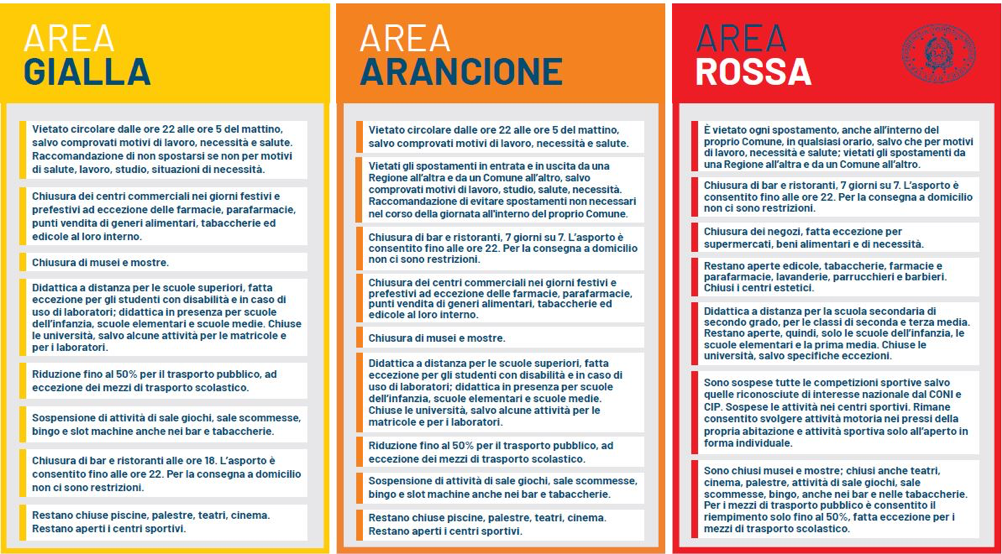 Con il nuovo Dpcm – in vigore dal 6 novembre al 3 dicembre – il governo vuole cercare di arginare la crescita dei contagi da Covid 19 con restrizioni mirate nelle zone considerate più a rischio. Una sorta di lockdown territoriale. Inizialmente l’entrata in vigore era previsto per giovedì 5 novembre, ma il governo ha deciso di rinviare tutte le misure, anche quelle nazionali (zona gialla), a venerdì 6 novembre.