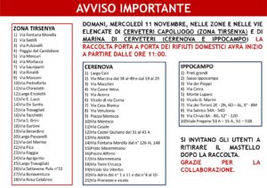 Si rende noto che nella sola giornata di domani, mercoledì 11 novembre, esclusivamente nelle zone Tyrsenia, Cerenova e Ippocampo, la raccolta porta a porta dei rifiuti domestici avrà inizio a partire dalle ore 11:00.