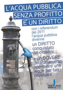 Nessuno vuole mettere in discussione il mercato, come molti buontemponi o svariati spregiudicati “esperti di economia” sostengono: mettiamo fortissimamente in discussione il principio di lucrare su un bene comune e critichiamo allo stesso tempo la violazione palese di un principio fondamentale della nostra democrazia: il rispetto del voto popolare, che ha stabilito a stragrande maggioranza che l’acqua deve essere svincolata dalle regole del mercato.