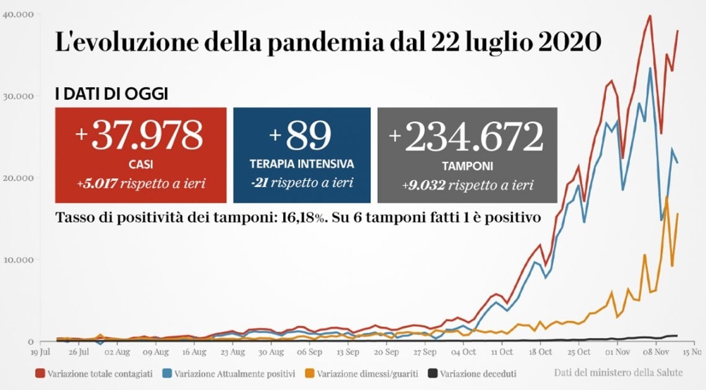 Sono 37.978 i nuovi contagi da coronavirus in Italia nelle ultime 24 ore, secondo i dati del ministero della Salute. Le vittime sono 636. I ricoveri in terapia intensiva aumentano di 89 unitΓ e raggiungono quota 3170: quelli negli altri reparti sono 29.873 (+429). I guariti sono 15.645 (387.758 dall’inizio dell’epidemia). Da segnalare il record dei tamponi: 234.672 nelle ultime 24 ore. Le regioni col maggior numero di contagi sono Lombardia (9.291), Piemonte (4.787), Campania (4.065), Veneto (3.564) e Lazio (2.686).