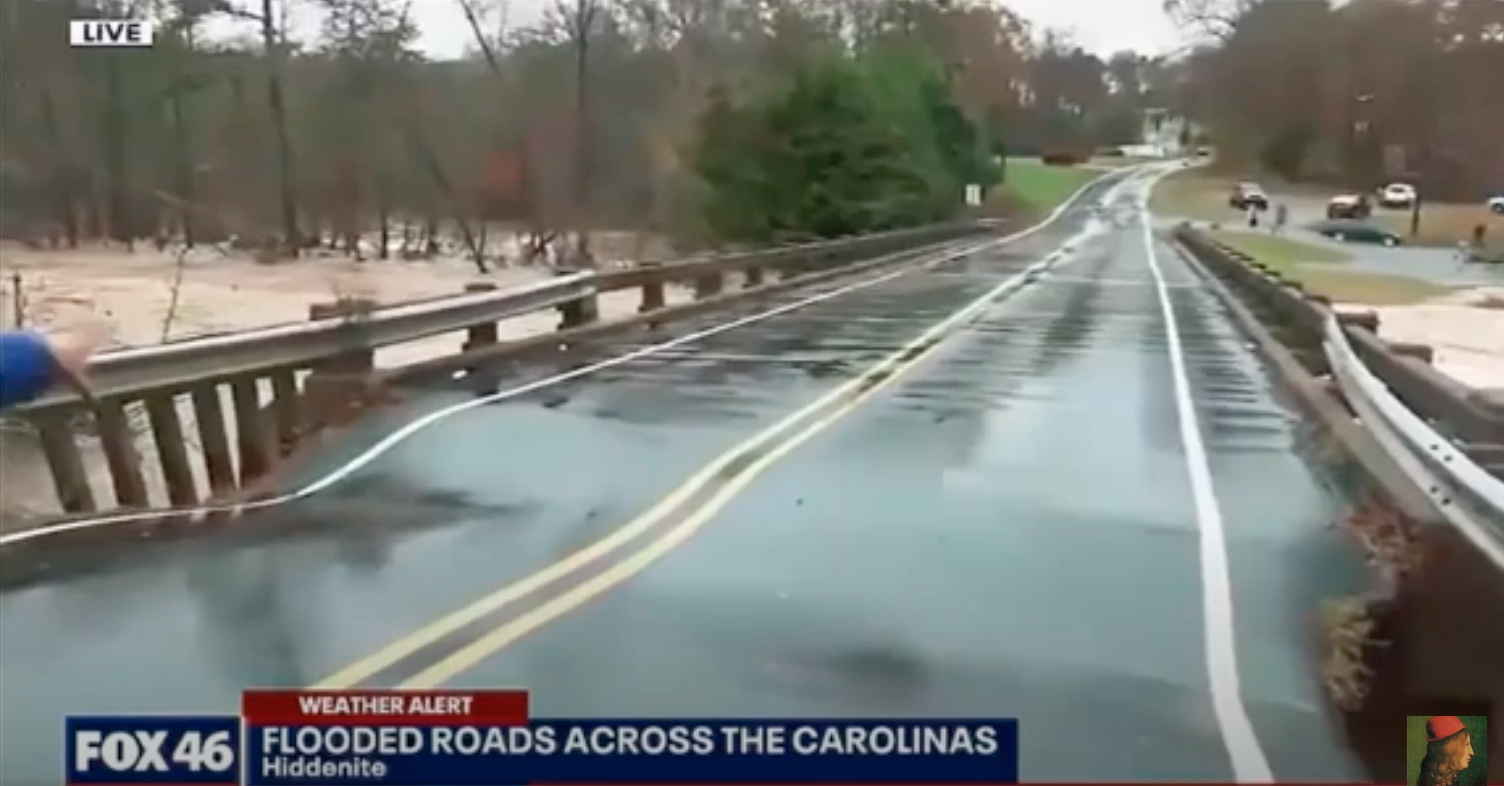 “Questo ponte sta letteralmente affondando” commenta la giornalista di Fox 46 Amber Roberts mentre è in diretta su un ponte che attraversa un fiume in piena nella contea di Alexander (Carolina del Nord). Un attimo dopo, nel manto stradale si apre una voragine, a pochi centimetri dai piedi della reporter e del suo operatore, che urlando fanno un balzo indietro. Il collegamento si interrompe e dopo due ore di nuovo la giornalista torna in diretta per raccontare l’accaduto: “È stato spaventoso ma abbiamo mantenuto la calma. Il ponte ora è in pessime condizioni”