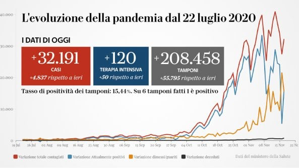 Il bollettino quotidiano sull’epidemia di coronavirus del ministero della Salute oggi registra 32.191 nuovi positivi e 731 morti. I ricoveri in terapia intensiva sono aumentati di 120 unità (3612 in totale), quelli nei reparti ordinari sono 538 in più (complessivamente 33.074). Nelle ultime 24 ore sono stati fatti 208.458 tamponi. A proposito degli ultimi dati, il direttore generale della Prevenzione del Ministero della Salute, Gianni Rezza, durante la conferenza stampa sull’analisi della situazione epidemiologica, ha spiegato che “c’è una sorta di stabilizzazione nel numero di test positivi, forse una leggera diminuzione”.