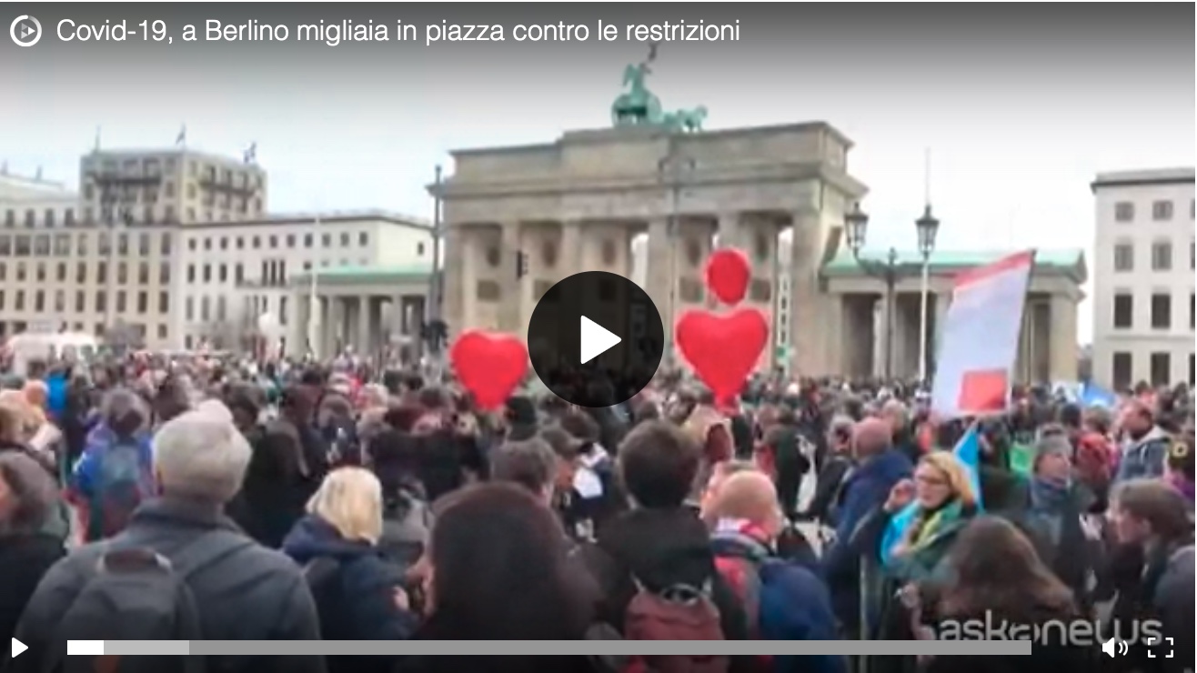 Roma, 18 novembre 2020 – Scontri e manifestanti no-mask dispersi in Germania nel giorno delle proteste contro le restrizioni imposte dal governo tedesco per contenere la pandemia da Coronavirus. Nella capitale la polizia ha revocato l’autorizzazione a una grande protesta perché i manifestanti che si rifiutavano di indossare le mascherine. Dispersa la folla Porta di Brandeburgo utilizzando cannoni ad acqua. Si stima che da 5.000 a 10.000 persone si siano radunate nel centro della città. I manifestanti, che hanno suonato fischietti, sbattuto pentole e indossato occhiali al posto delle mascherine, volevano avvicinarsi al parlamento. Un portavoce della polizia ha affermato che i fermati sono finora oltre 100.