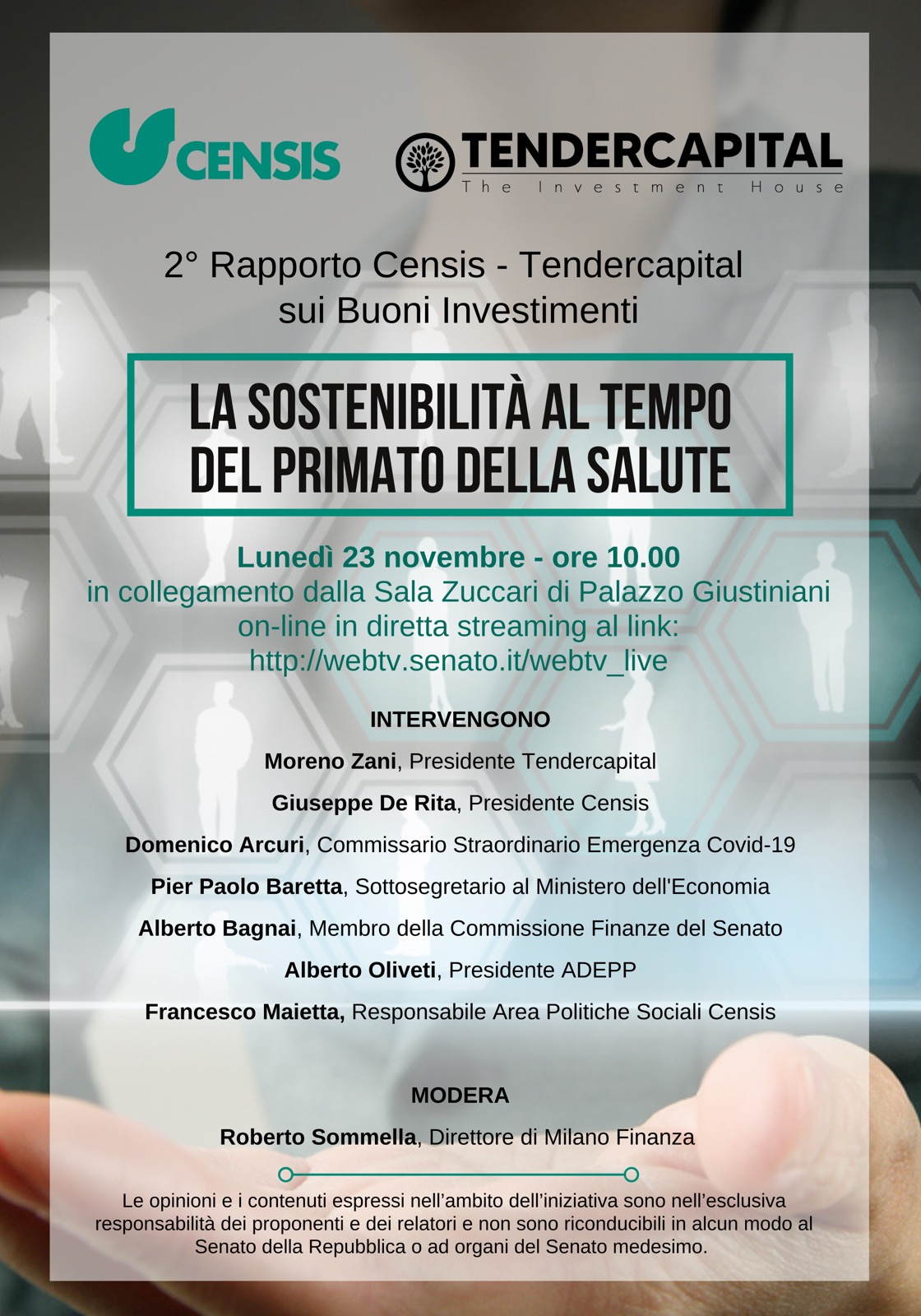 Lunedì 23 novembre, alle 10 nella Sala Zuccari di Palazzo Giustiniani a Roma, si terrà la presentazione del Secondo Rapporto Censis-Tendercapital sui Buoni Investimenti “La sostenibilità al tempo del primato della salute”. L’obiettivo è porre l’attenzione sulla sostenibilità sociale, intesa come l’equo accesso per tutti al benessere, con un focus sull’attualità che riguarda l’inedita emergenza sanitaria che il Paese sta attraversando tramite le opinioni, i comportamenti e i valori degli italiani. Il rapporto propone una riflessione approfondita su cosa potrà accadere nel lungo periodo, per non ritrovarci in una società devastata, profondamente ingiusta e con enormi costi economici e sociali da pagare.