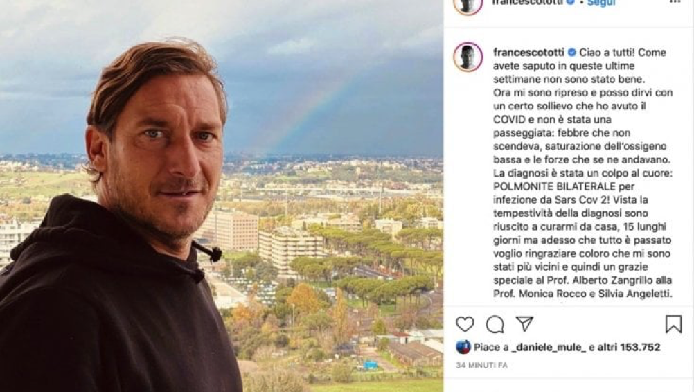 “La diagnosi è stata un colpo al cuore – continua Francesco – Polmonite bilaterale per infezione da Sars Cov 2! Vista la tempestività della diagnosi sono riuscito a curarmi da casa, 15 lunghi giorni ma adesso che tutto è passato voglio ringraziare coloro che mi sono stati più vicini e quindi un grazie speciale al Prof. Alberto Zangrillo alla Prof. Monica Rocco e Silvia Angeletti. Il Covid – il messaggio finale di Totti – si può battere con le giuste precauzioni e indicazioni”. Le due dottoresse lavorano al Campus biomedico, struttura nella quale Francesco è stato a un passo dall’esser ricoverato. Prima la positività, scoperta e tenuta nascosta per privacy (il 2 novembre è uscita l’indiscrezione), a cavallo dei mesi di ottobre e novembre, con febbre e uno stato di malessere generale. Poi il peggioramento, con la pesante diagnosi a distanza del professor Alberto Zangrillo, primario del San Raffaele di Milano e medico di fiducia di Berlusconi.