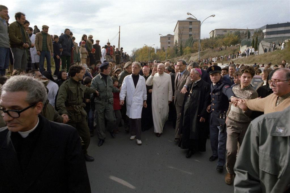 videro passare il Papa, Giovanni Paolo II, che si dirigeva a piedi verso la piazza – l’unica – del paese, dove tutta la tragedia era racchiusa, come un cratere nel cratere: