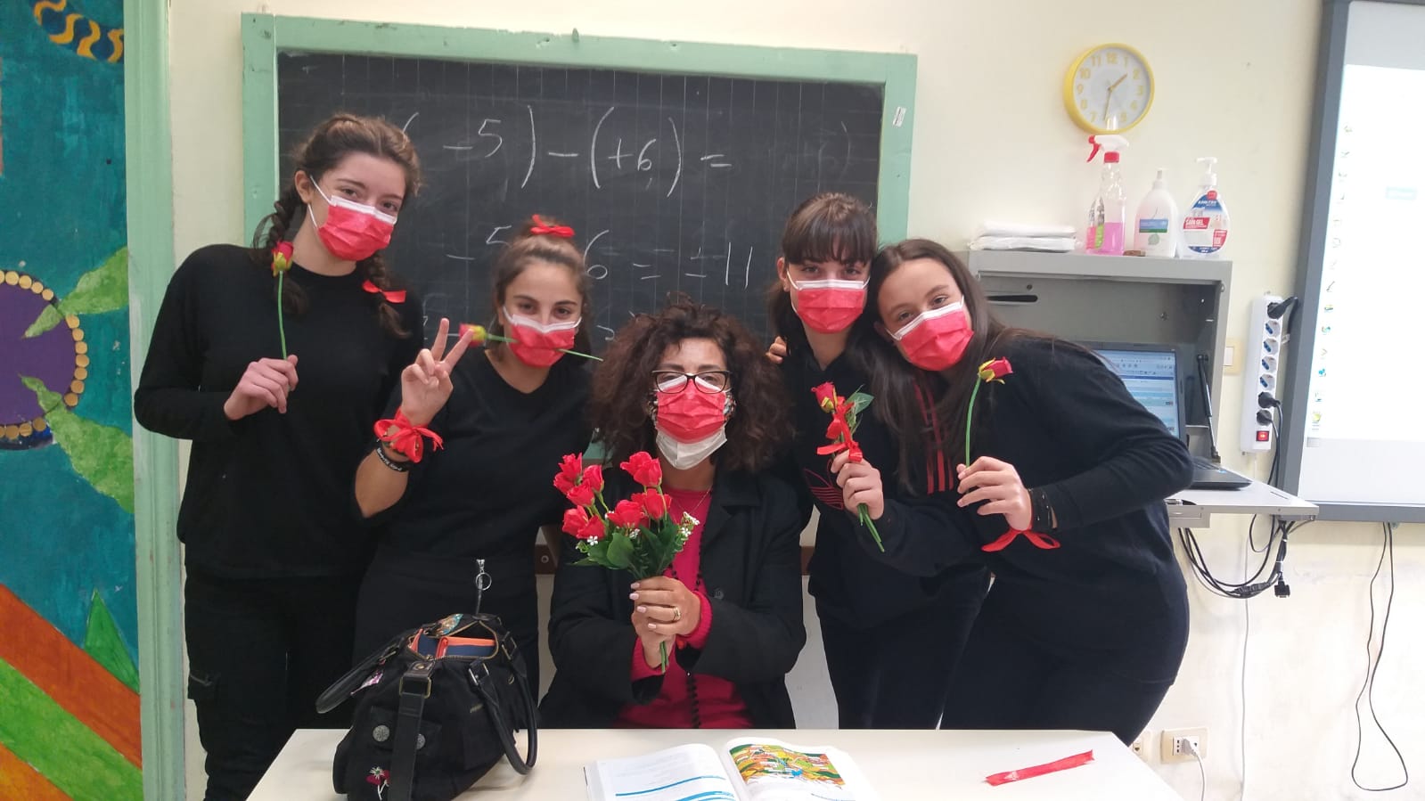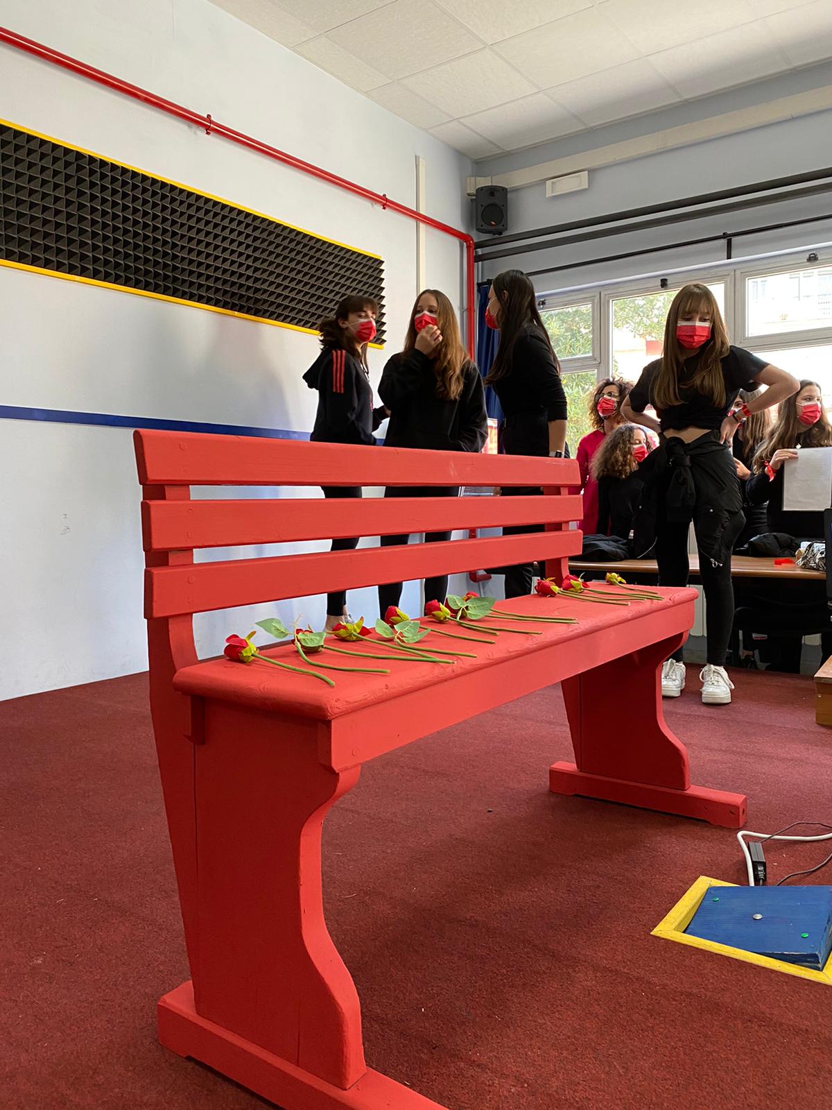 I ragazzi, a questo punto, accompagnati dalla dolce melodia del violino suonato dal maestro e collega Luca Rocco hanno voluto omaggiare con una rosa, uno alla volta, le ragazze, rimaste in piedi, a semicerchio, attorno a detta panchina rossa.