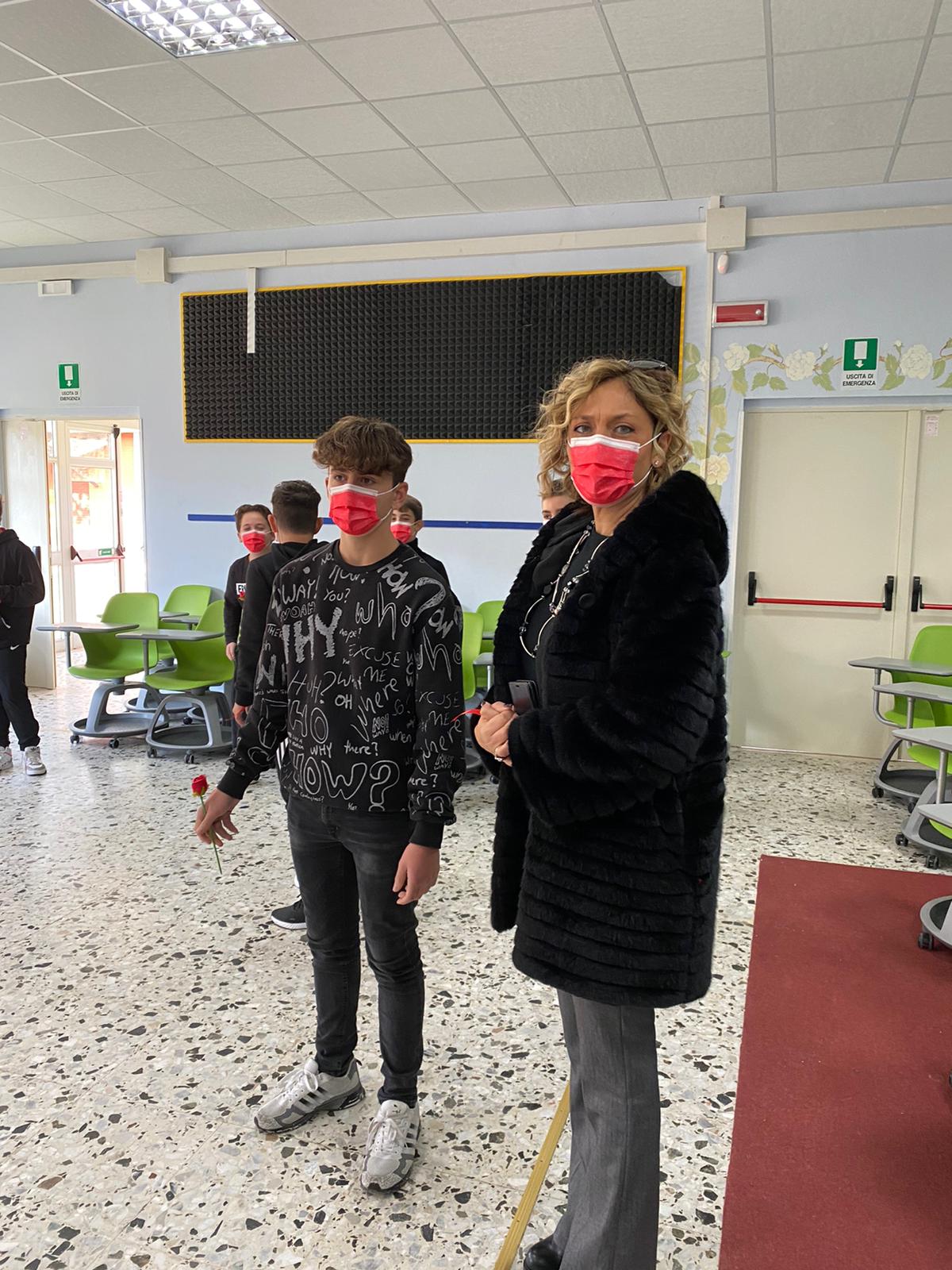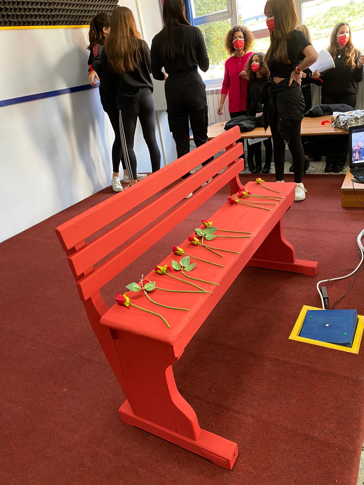 I ragazzi, a questo punto, accompagnati dalla dolce melodia del violino suonato dal maestro e collega Luca Rocco hanno voluto omaggiare con una rosa, uno alla volta, le ragazze, rimaste in piedi, a semicerchio, attorno a detta panchina rossa.