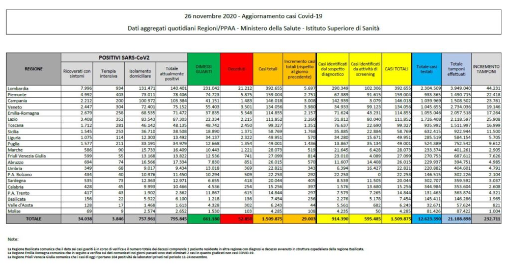 A livello territoriale, le Regioni con il maggior numero di contagi sono la Lombardia (5.697), il Veneto (3.980), la Campania (3.008), il Piemonte (2.751), il Lazio (2.260) e l’Emilia-Romagna (2.157)