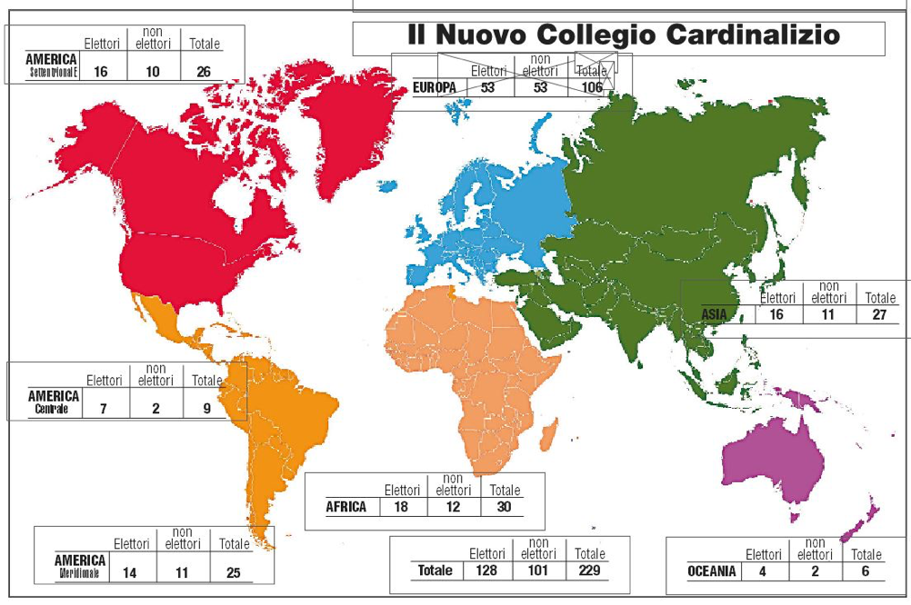 I nuovi cardinali ufficialmente «pubblicati» oggi sono tredici, ma due di loro non hanno potuto essere materialmente presenti, perché bloccati in patria: il vicario apostolico del Brunei Cornelius Sim e il filippino José F. Advincula, arcivescovo di Capiz. Gli italiani sono sei. Tre con meno di 80 anni e quindi con diritto di voto in un eventuale Conclave. E cioè: Marcello Semeraro, prefetto della Congregazione delle cause dei santi a cui è stata assegnata la diaconia di Santa Maria in Domnica; Augusto Paolo Lojudice, arcivescovo di Siena-Colle Val d’Elsa-Montalcino (titolo di Santa Maria del Buon Consiglio, parrocchia dove è stato giovane prete); Mauro Gambetti (diaconia del Santissimo Nome di Maria al Foro Traiano). Altri tre invece hanno più di 80 anni e sono: il nunzio e delegato presso l’Ordine di Malta Silvano Maria Tomasi (diaconia di San Nicola in carcere), padre Raniero Cantalamessa (diaconia di Sant’Apollinare delle Terme Neroniane-Alessandrine) ed Enrico Feroci (diaconia di Santa Maria del Divino Amore, Francesco nel consegnargli la bolla con un sorriso affettuoso gli ha detto: «il Papa fa cardinale un parroco, è la tua parrocchia»). Gli altri cardinali creati oggi sono il maltese Mario Grech, segretario generale del Sinodo dei vescovi, lo statunitense Wilton D. Gregory, arcivescovo di Washington (il primo cardinale di colore degli Usa), l’arcivescovo di Kigali in Rwanda Antoine Kambanda, l’arcivescovo di Santiago del Cile Celestino Aos Braco, e infine l’ultraottantenne vescovo emerito di San Cristobal de Las Casas in Messico Felipe Arizmendi Esquivel.